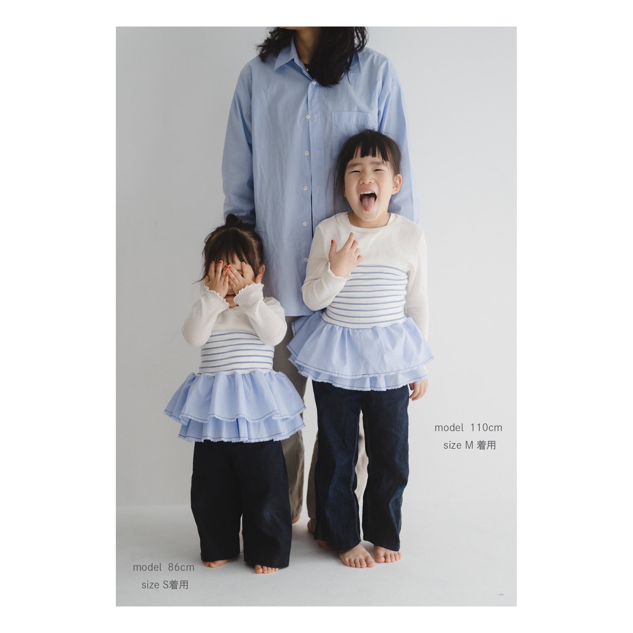 スカート部分はあえて裁ち切りのニュアンスを残し、2本の配色ステッチを効かせることで、動きに合わせて揺れる立体的なフリルを表情豊かに演出。